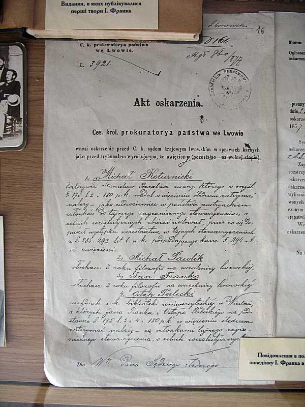 Перша сторінка акту звинувачення І. Я. Франка й товаришів (1877 р.)Розмір зображення: 600:800 піксел Фото Зенона Боровця, 21 вересня 2006 р. |