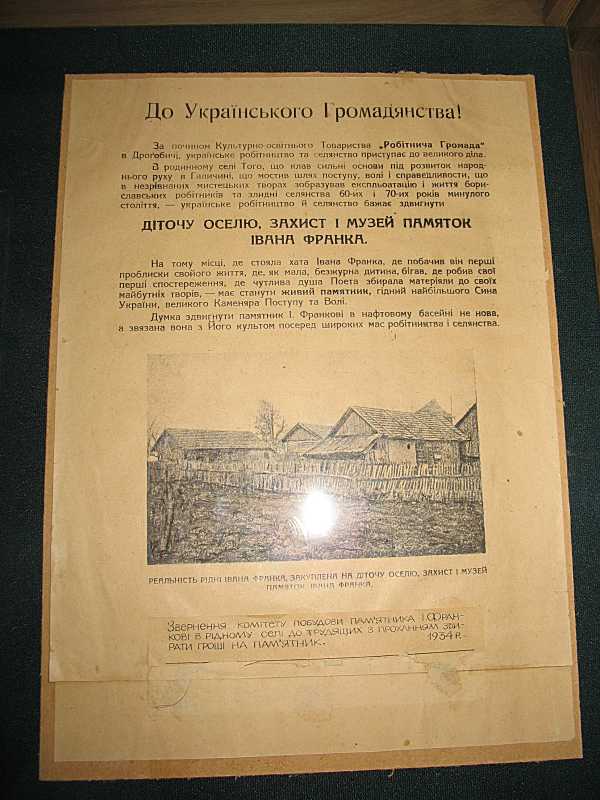 Звернення до громадянстваРозмір зображення: 600:800 піксел Фото Зенона Боровця, 18 липня 2007 р. Прохання збирати кошти на дитячу оселю, захист та музей пам’яток І. Франка, 1934 р. |