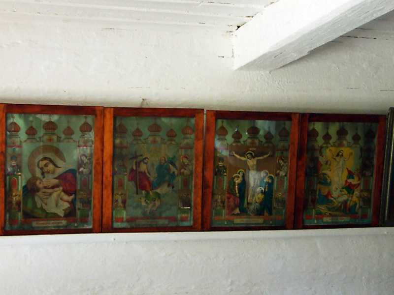 2013 р. Центральна група іконРозмір зображення: 800:600 піксел 17 квітня 2013 р. Фото М.І.Жарких. Від лівого боку: Богородиця з немовлям. Новозавітна трійця. Розв’яття. Воскресіння. |