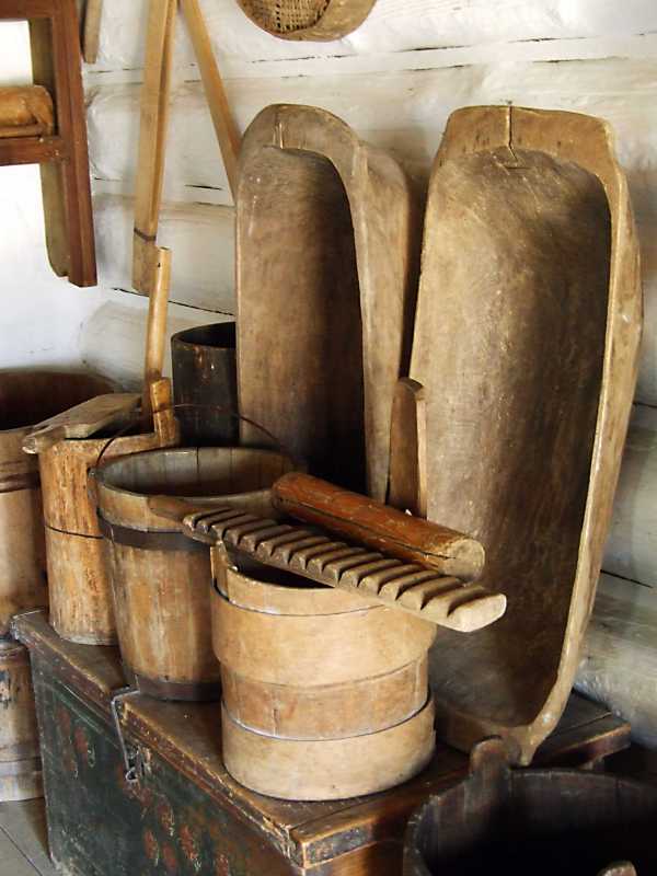 2013 р. Дерев’яні ночви та відраРозмір зображення: 600:800 піксел 17 квітня 2013 р. Фото М.І.Жарких. Відра стоять на скрині з металевою защілкою. На відрі лежить рубель для прання одягу. |