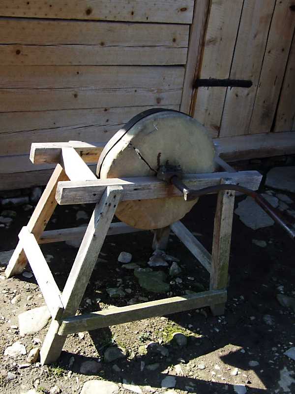Круглий точильний камінь (натріснутий, обтягнений залізною шиною) насаджено на залізну вісь із корбою. Все змонтовано на дерев’яних козлах.