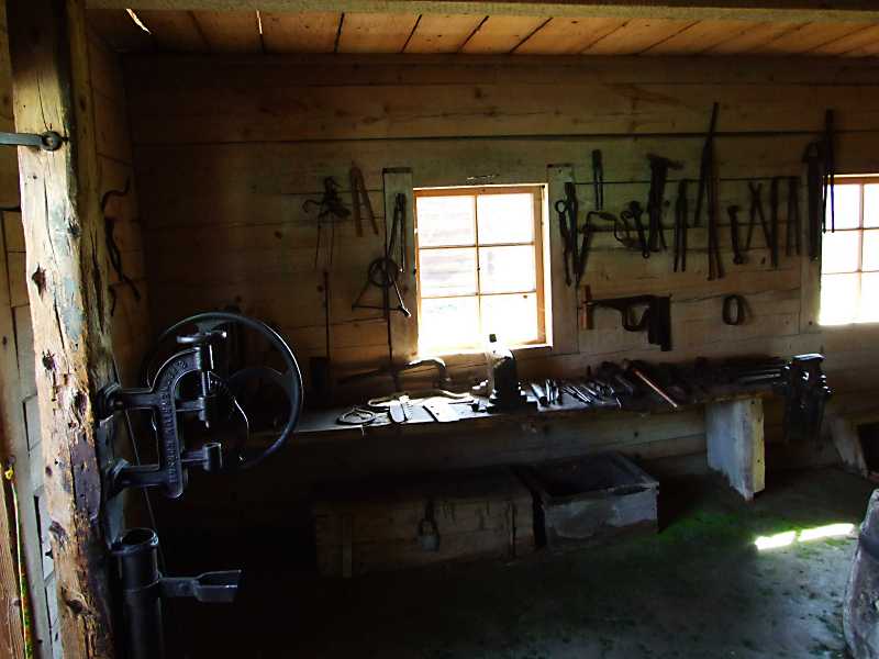 Ліворуч – свердлильний станок, прикручений до стовпа вхідних дверей. Під вікном – слюсарський верстак з лещатами та інструментами. На стіні над верстаком висять різні кліщі.