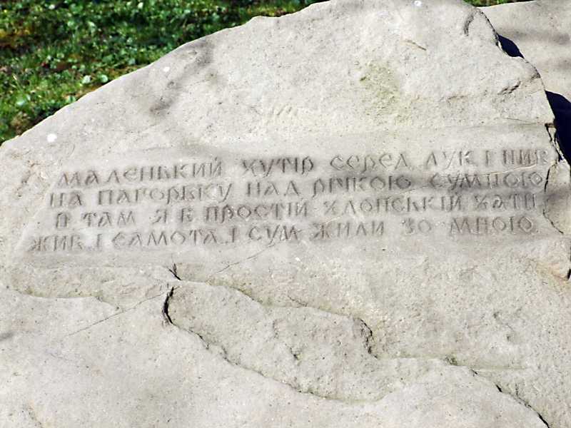 2013 р. Напис на каменіРозмір зображення: 800:600 піксел 17 квітня 2013 р. Фото М.І.Жарких. Напис такий: Маленький хутір серед лук і нив на горбику над річкою шумною – отам я в простій хлопській хаті жив, і самота, і сум жили зо мною. І. Франко . |