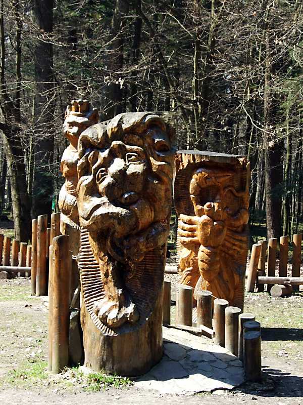 2013 р. СкульптуриРозмір зображення: 600:800 піксел На задньому плані – лис Микита, праворуч – рак. А що за звір в центрі – я, далебі, не годен здогадатись. 17 квітня 2013 р. Фото М.І.Жарких. |