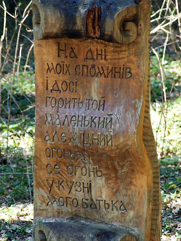 2013 р. Таблиця з написомРозмір зображення: 600:800 піксел 17 квітня 2013 р. Фото М.І.Жарких. На дні моїх споминів і досі горить той маленький, але міцний огонь… Се огонь у кузні мойого батька… [І. Франко ] |