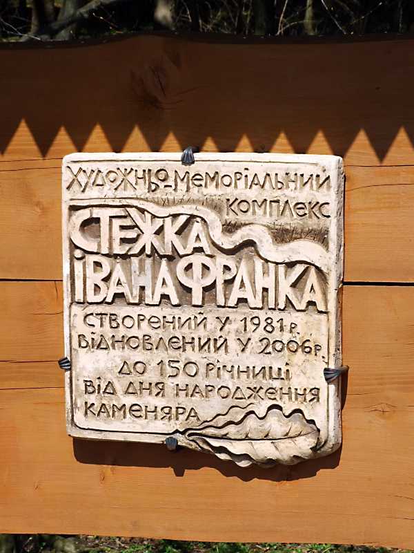 Напис: «Художньо-меморіальний комплекс Стежка івана Франка створений в 1981 р., відновлений у 2006 р. до 150 річниці від дня народження каменяра».