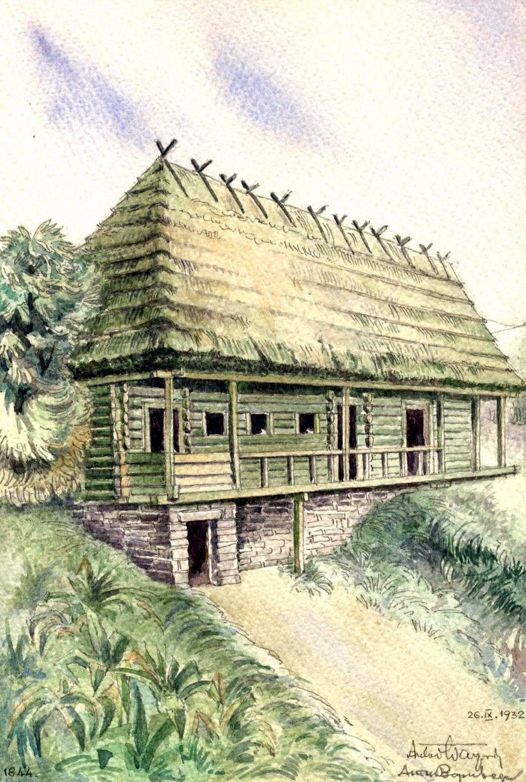 1932 р. Хата. Загальний виглядРозмір зображення: 1044:1554 піксел Рисунок Антона Вариводи (Краків), 26.09.1932 р. 1844 Dwelling, Nasichne (Nasieczne). Southwestern view showing stone masonry foundation. |