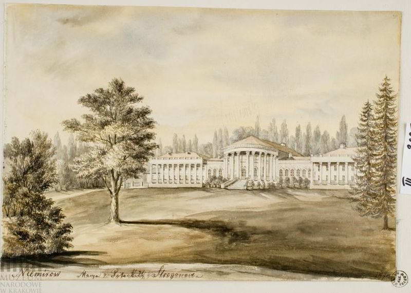Pałac Strogonowów dawniej Potockich. Widok od strony ogrodu. Pałac na planie wydłużonego prostokąta, dwukondygnacjowy z wyższą częścią środkową półkoliście zamkniętą i otoczoną kolumnadą oraz ryzalitami bocznymi z dziesięciokolumnowymi portykami. Dat.: 29 Sierp. 1871 [?]. Napis: Niemirów – Marya z Potockich Strogonow; napis na podkładzie: Niemirów Gub. Podolska. Wyrugowawszy Olgerd W.X.L. Tatarów oddał Podole r. 1331. Synowcom Korjatowiczom. Niejakiś Niemira wynagrodzony ziemią za długi orężem – Wybudował… [nieczytelne] 1688. – Kozacy pod Chmielnickim r. 1648 wielką rzeź sprawili – Własność Jeremiasza Wiśniowieckiego, a następnie familij Szczęsnego Hr Potockiego. 1871 [?]. Rys. ołówkiem podmalowany akwarelą. 19,4 x 28,3 cm. Muzeum Narodowe, Kraków. III-r.a. 3005. (Teka Podole). [Katalog rysunków architektonicznych ze zbiorów Muzeum narodowego w Krakowie. 1. Rysunki Napoleona Ordy / Opracowały Zofia Kucielska i Zofia Tobiaszowa. – Warszawa: Państwowe wydawnictwo naukowe, 1975, Nr. 463]