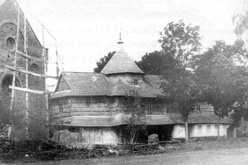 Дерев’яна однобанна церква галицького типу, збудована в 1775 році. Складалася з трьох прямокутних обсягів – ширшої нави посередині, вужчих прямокутного бабинця від заходу й прямокутного вівтаря від сходу, з мурованими захристіями, прибудованими пізніше до південної і північної його стін. Над навою був стіжковий восьмибічний намет, розміщений на низькому й вузькому світловому восьмерикові й завершений сліпим ліхтарем з маківкою. Бабинець покривав двосхилий причілковий дах з острішком, а вівтар – трисхилий. Оперізувало споруду широке піддашшя, сперте на профільовані випусти вінців зрубів. У 1901 році неподалік почали зводити новий мурований храм. Після завершення в 1908 році будівництва стару церкву наступного року розібрали.