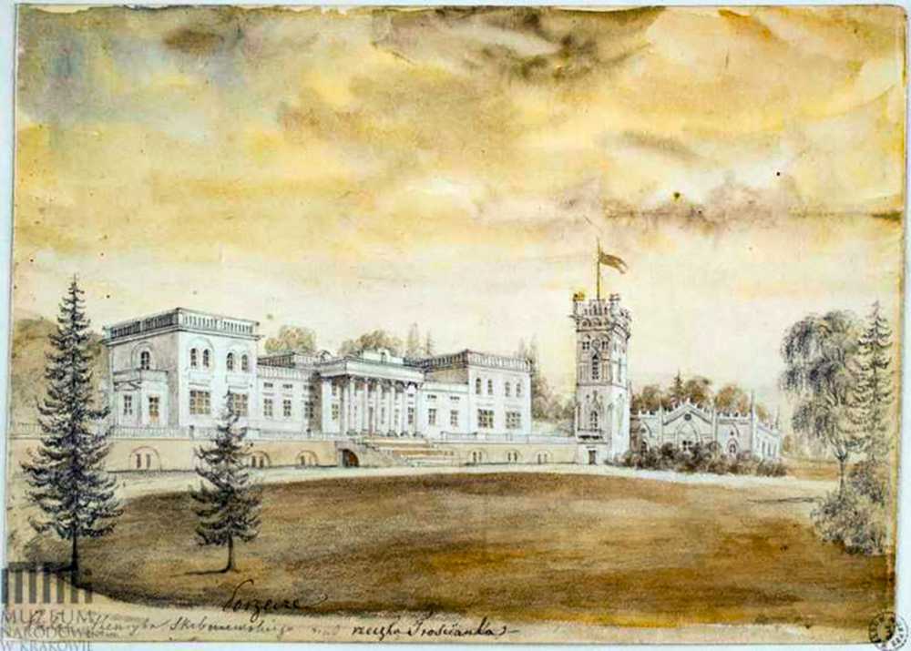 Pałac Skibniewskich. Widok od strony podjazdu.Na wysoko podpiwniczonym tarasie pałac parterowy z mezzaninem i piętrowymi ryzalitami bocznymi, z portykiem kolumnowym w wielkim porządku w części środkowej, zwieńczony attyką wnękową; z prawej strony czworoboczna wieża i parterowy pawilon z ostrołukowymi oknami, sterczynami i krenelażem. Napis: Porzecze; Pałac Henryka Skibniewskiego nad rzeczką Trościanką; napis na podkładzie: Podole Porzecze, – pałac. 1871-1873. Rys. ołówkiem podmalowany akwarelą. 20,1 x 28,1 cm. Muzeum Narodowe, Kraków. III-r.a. 3020. (Teka Podole). [Katalog rysunków architektonicznych ze zbiorów Muzeum narodowego w Krakowie. 1. Rysunki Napoleona Ordy / Opracowały Zofia Kucielska i Zofia Tobiaszowa. – Warszawa: Państwowe wydawnictwo naukowe, 1975, Nr. 572]