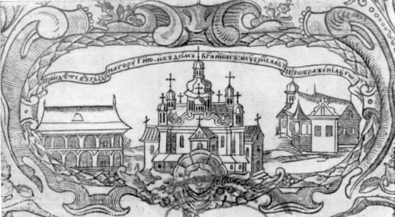Фрагмент заглавного листа книги «Анфологион», изданной в Новгород-Северске в 1678 г. Изображение зданий Новгород-Северского Спасского монастыря (стр. 23)