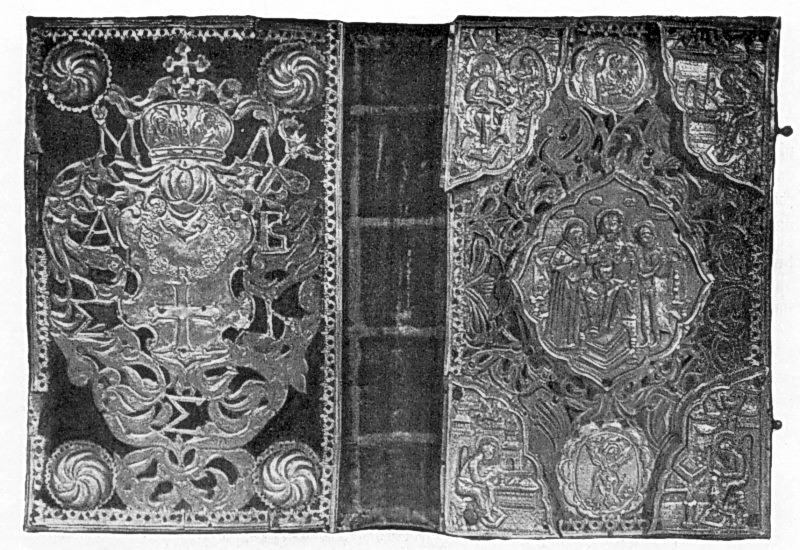 Варто зупинитися ще на одній чернігівській оправі євангелія московського друку 1663 р. Обидві її дошки, на відміну від попередніх оправ, обтягнуті оксамитом вишневого кольору. Середник чільної сторони має форму ромба з хвилястими краями. В центрі викарбувані невиразні три постаті: посередині Христос (на троні), а по боках – богородиця й Іоанн Хреститель. Наріжники мають таку ж форму, як і в попередній оправі. Між верхніми й нижніми наріжниками – два медальйони з зображенням святих. Простір навколо середника оздоблено прорізним орнаментом рослинного характеру, причому листя й пагінці трактовані досить оригінально – всі вони ніби почленовані вподовж канелюрами. Такого ж характеру орнамент зустрічається в ліпних прикрасах культових споруд, зокрема в Преображенському соборі села Мгар Полтавської області. Спідня дошка теж обтягнута оксамитом. В центрі оправи – срібний карбований герб архімандрита новгород-сіверського Спасо-Преображенського монастиря Михайла Лежайського. На геральдичному щитку викарбувано чотирикінцевий хрест, що звисає на ланцюжку у вигляді вінка з квітів. Над щитком – митра. Навколо щитка – пишний прорізний рослинний орнамент з широкого стилізованого листя. На тлі орнаменту вирізьблено золотом напис: «Михайло Лежайський Архімандрит Всемилостивого спаса Новгород Сіверського» (ЧДІМ, № 176). (с. 86 – 89)