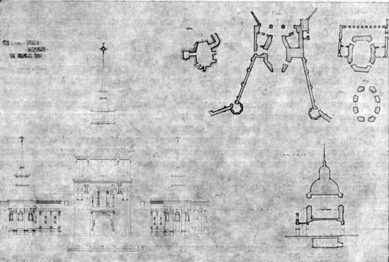 Надбрамна башта. Фасад, плани, перерізиРозмір зображення: 800:540 піксел Надвратная башня-колокольня Новгород-Северского Спасского монастыря, 1670-1699 гг. (обмеры Кацаурова). Музей АСиА СССР в Москве (стр. 116) |