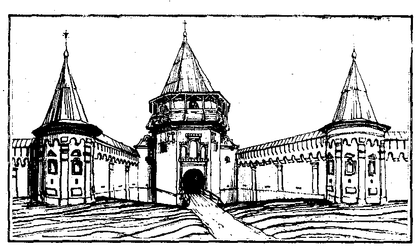 В’їзна башта-дзвіниця. Вигляд з південного заходу на кінець XVII – початок XVIII ст.