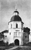 В 30-е годы XIX в. шатровое покрытие было заменено шлемовидным куполом. В 1850 г. засыпан ров, а вместо моста устроен тротуар. Колокольня решена в формах барокко, из кирпича, оштукатурена, побелена, имеет сложное объемно-пространственное решение. С напольной стороны представляет собой трехъярусную граненую башню, увенчанную небольшой главой и шпилем. Архитектура напольных граней строга и монументальна, и только декоративное оформление арки проезда подчеркивает ее значение как главных ворот. Восьмерик башенного объема со стороны двора заключен в двухэтажный, прямоугольный в плане объем. Восточный фасад его решен в виде двухъярусной галереи-аркады. В первом этаже – три больших арки, опирающиеся на массивные пилоны. Над арками – пояс, декорированный двенадцатью арочными нишами, на котором стоит невысокая девятипролетная аркада, ограждающая расположенное на втором этаже памятника гульбище, перекрытое пологой скатной крышей. Проезд и все помещения первого этажа перекрыты полуциркульными сводами. В подвальном ярусе под башенным объемом сохранились камеры четырех бойниц, первоначально обращенных в сторону рва. Сохранились бойницы в стенах первого яруса башни. В 1984 г. закончены реставрационные работы. Памятник представляет интерес как сооружение, имевшее оборонительное назначение. Отличается своеобразием объемно-пространственной композиции и пластикой. [Памятники градостроительства и архитектуры УССР. – К.: Будівельник, 1986 г., т. 4, с. 317].