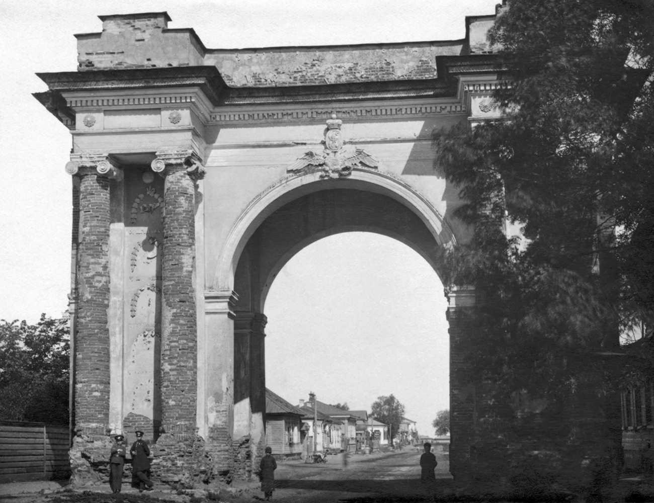Герби над проїздом і між колонами ще не обідрані. Якщо хлопці ліворуч – у гімназичній формі, то може бути і 1918-й рік