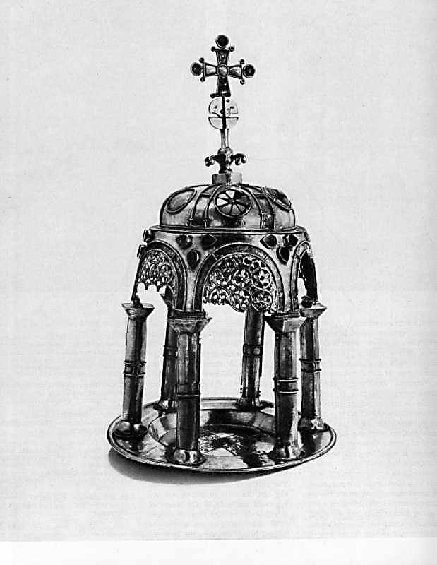Один из новгородских сионов дошел до нас в плохой сохранности, уцелел лишь самый остов из шести колонн и купола. Наибольший интерес представляют ажурные тимпаны арок с шестью большими серебряными цветами на каждом. Возможно, что это тот «Иерусалим», который был изготовлен новгородцами после того, как Всеслав Полоцкий, овладев Новгородом, взял существовавший там сион в качестве трофея. (Об этой обиде новгородцы помнили еще в 1180 году, когда их князь Мстислав Храбрый собирался отвоевывать церковную утварь у внука Всеслава.) (с. 50 – 51)