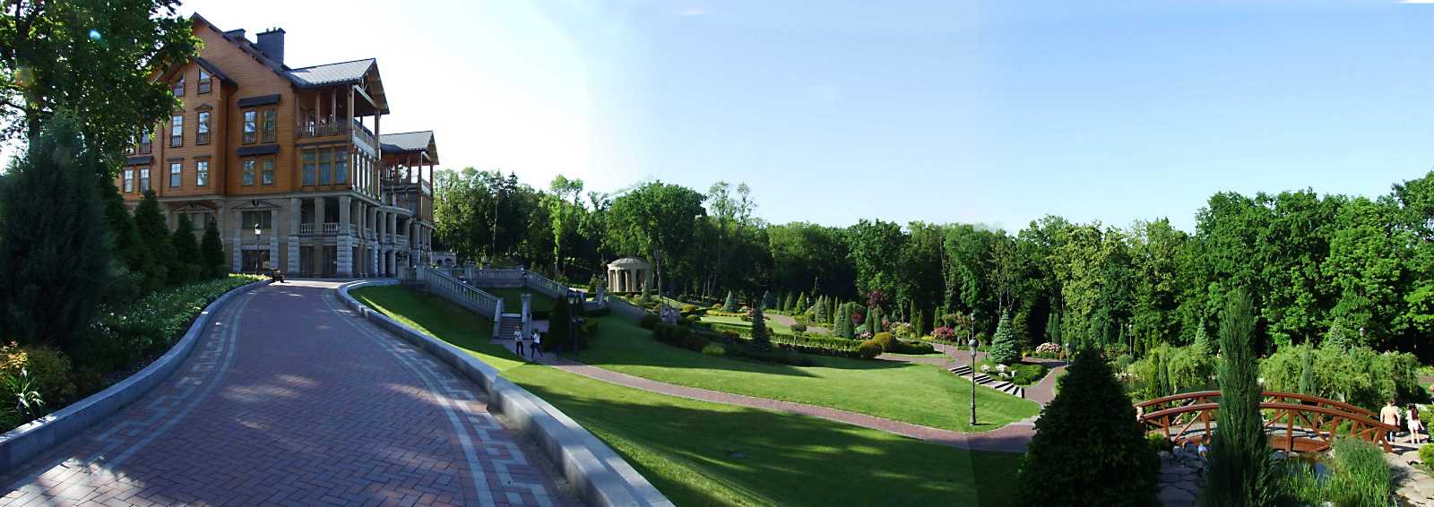 Панорама палацу (5) і партеру (24)Розмір зображення: 1600:566 піксел Вигляд з південного сходу. Фото М. І. Жарких, 22 травня 2015 р. |