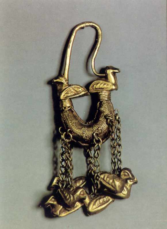 Сережка у формі півмісяця, прикрашеного зернистими трикутниками та фігурками качок на кінцях та підвісках.