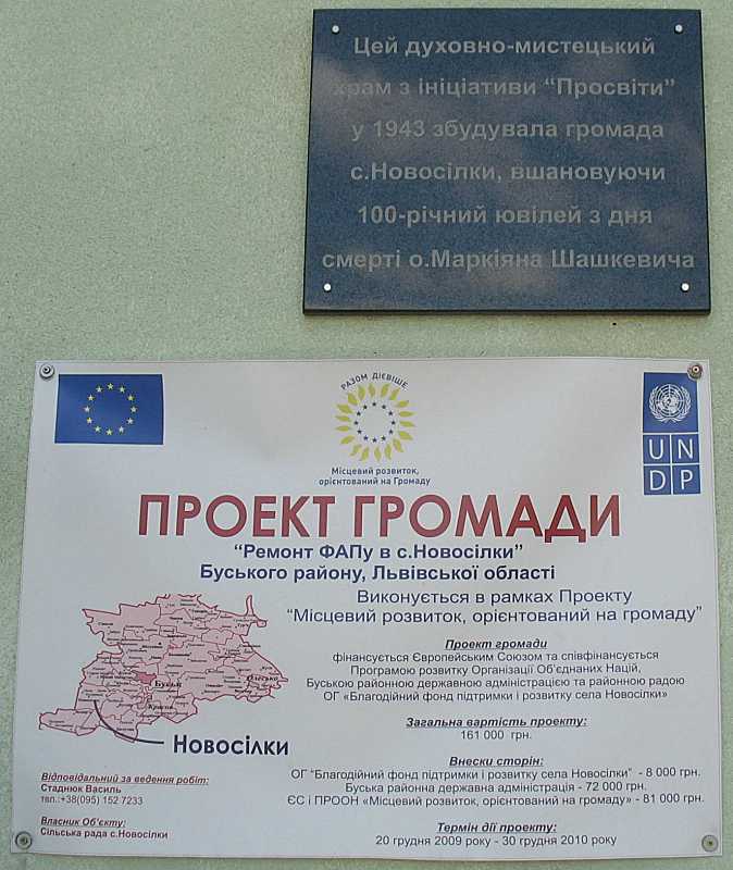 Напис: «Цей духовно-мистецький храм з ініціативи «Просвіти» у 1943 році здудувала громада с. Новосілки, вшановуючи 100-річний ювілей з дня смерті о. Маркііяна Шашкевича».