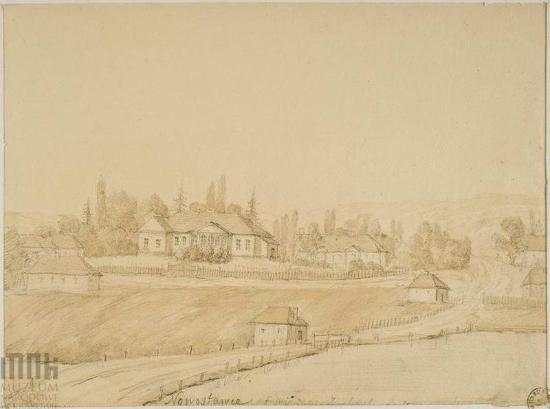 Dwór Zwolińskićh. Widok ogólny od strony stawu. Dwór parterowy z gankiem. 1862 – 1876. Dat.: 6 Września. Napis: Nowostawce P. Wincentego… [nieczytelne]; napis na podkładzie: Gub. Wołyńska Nowostawce, – dwór. Rys. ołówkiem podmalowany sepią, 18,3x24,7. III-r.a. 4216 (Teka Wołyń) [Katalog rysunków architektonicznych ze zbiorów Muzeum narodowego w Krakowie. 1. Rysunki Napoleona Ordy / Opracowały Zofia Kucielska i Zofia Tobiaszowa. – Warszawa: Państwowe wydawnictwo naukowe, 1975, Nr. 487]