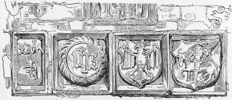 Різьблені плитиРозмір зображення: 800:345 піксел Рисунок Яна Матейки. Кам’яні плити на парафіальному костелі, заснованому Збігневом Олесницьким у 1448 р. Джерело: Sokołowski A. Dzieje Polski ilustrowane. – Warszawa, 1900, t. 2, s. 166. |