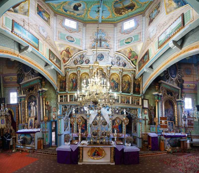 2019 р. Інтер’єр з видом на іконостасРозмір зображення: 800:698 піксел Фото з ФБ групи «Ukraina Incognita» (опубліковано 2.04.2019 р.) + Ще фото іконостасу (опубліковані 27.03.2019 р.) |