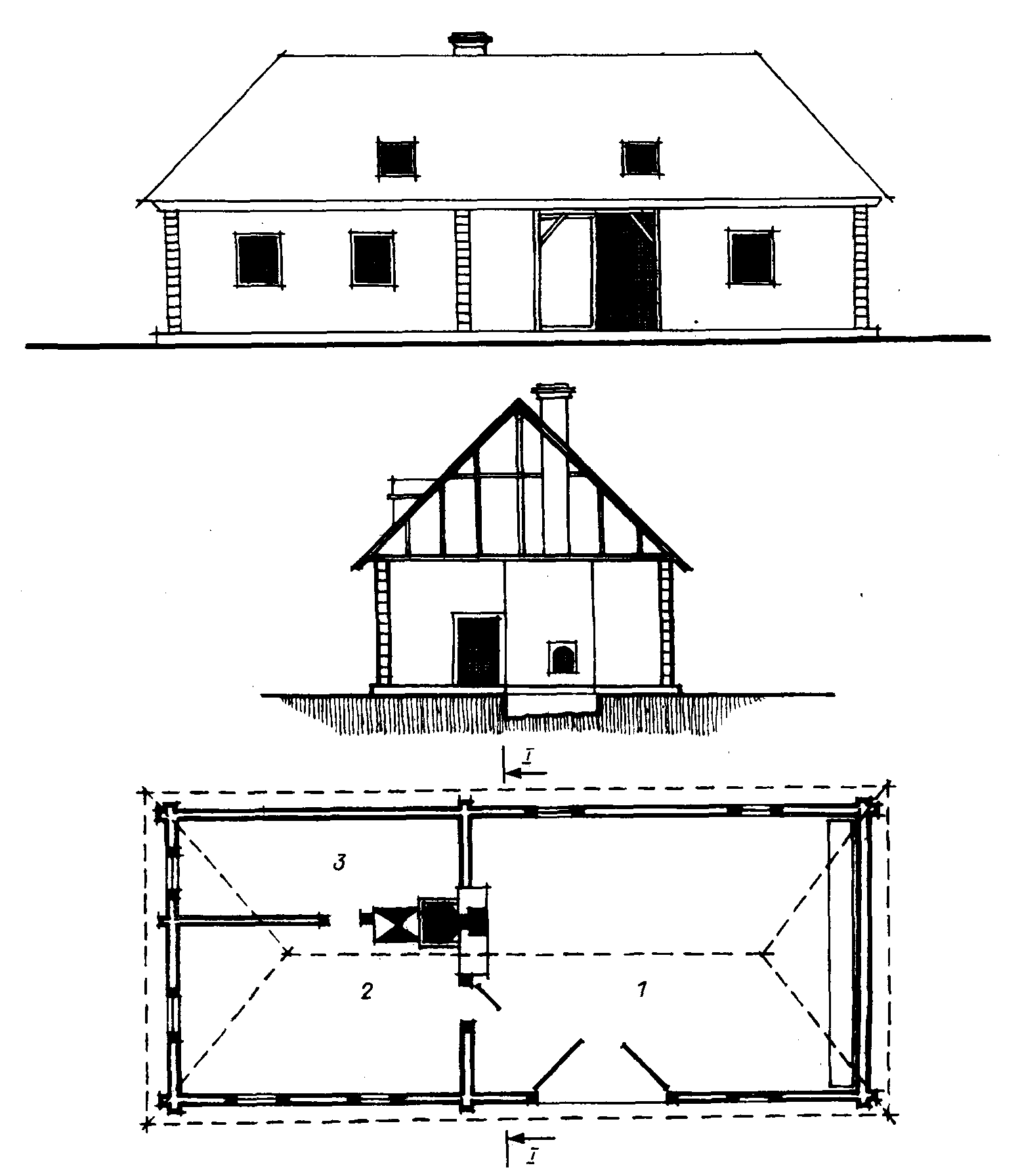 1 – сіни, стійло з жолобом та яслами, 2 – кімната, 3 – ванькир.