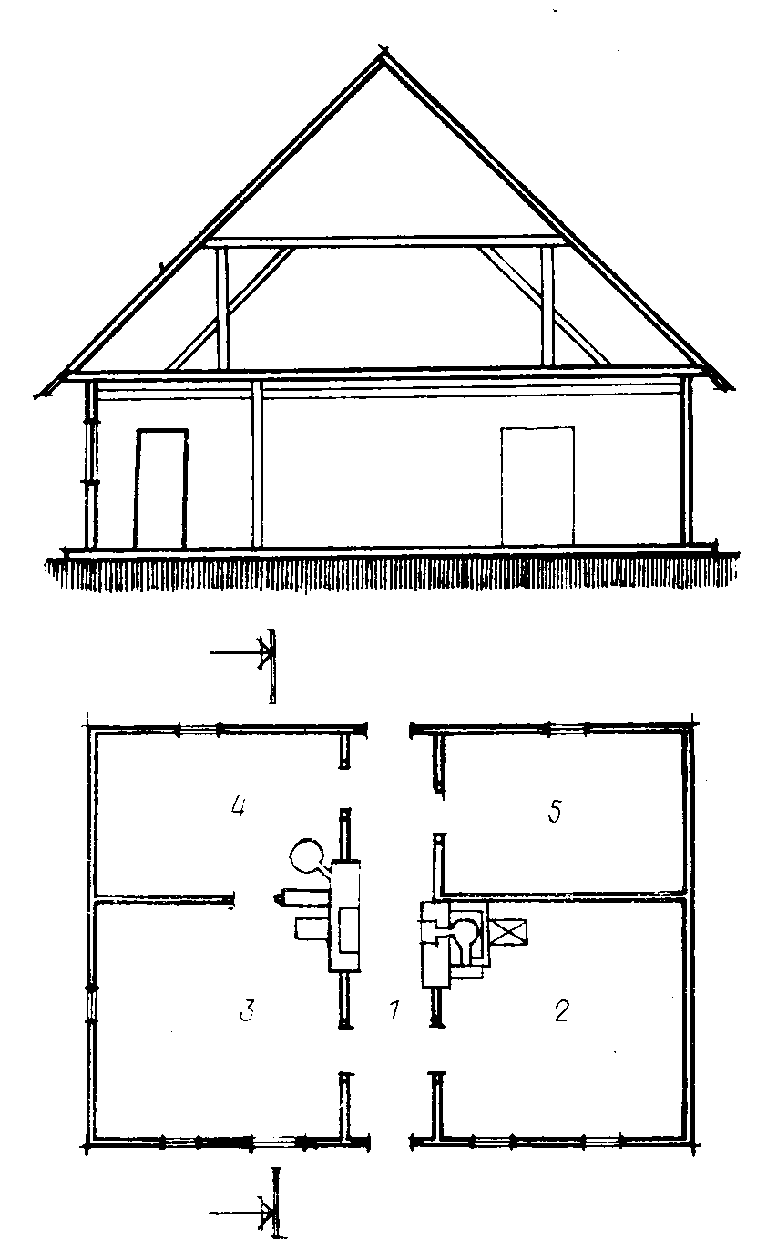 1 – сіни, 2 – хата-пекарня, 3 – світлиця-канцелярія, 4 – канцелярія, 5 – комора.
