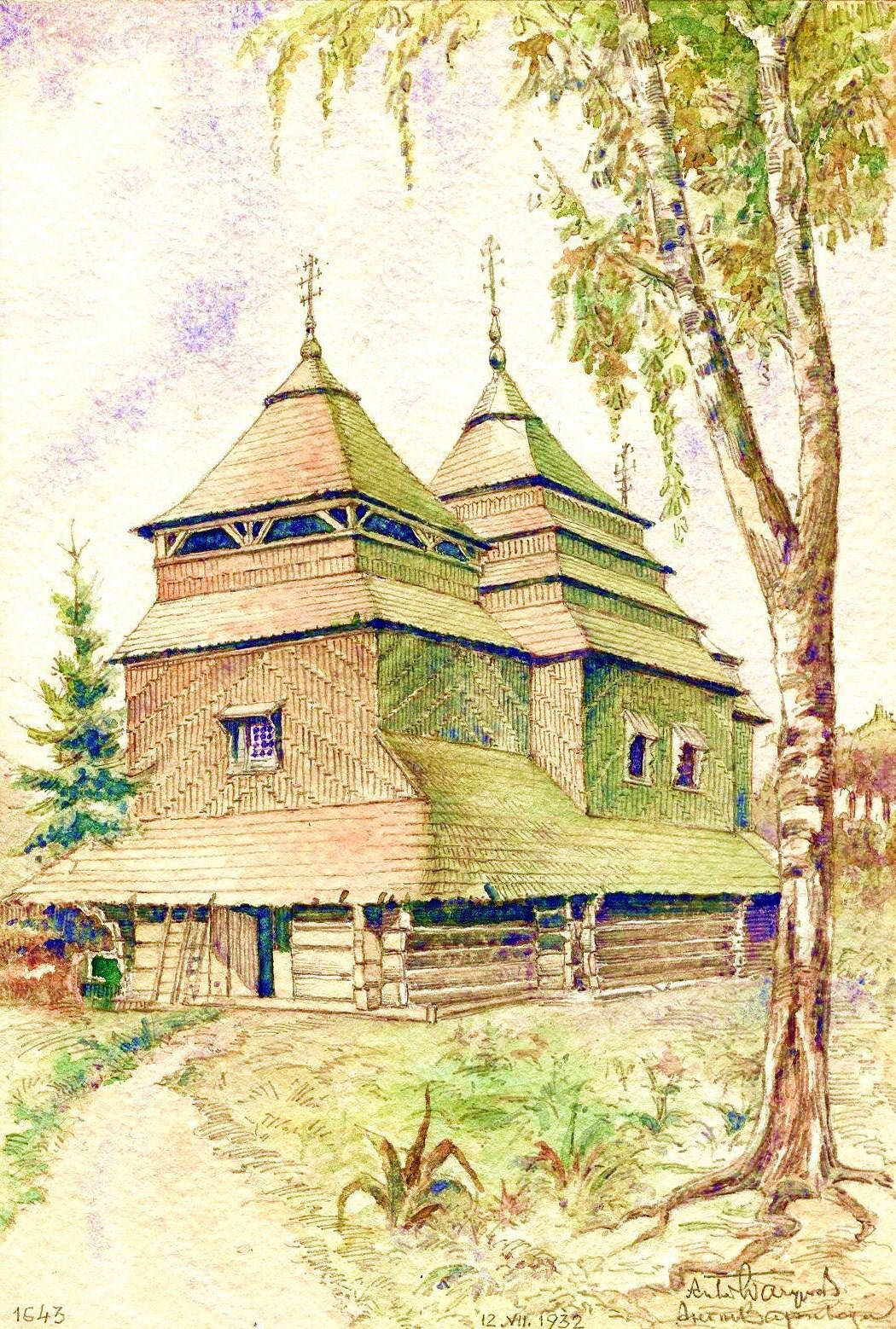 1932 р. Загальний вигляд з позиції А2Розмір зображення: 1050:1558 піксел Рисунок Антона Вариводи (Краків), 12.07.1932 р. 1643 Church, Botel’ka Nyzhnya (Butelka Nizna). Southwestern view. |