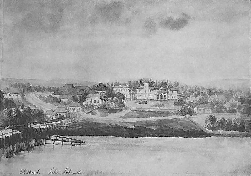 Pałac Sobańskich. Widok ogólny od strony rzeki Bernardynki. Pałac dwukondygnacjowy z tarasem wspartym na arkadach, wieżą z krenelażem oraz oficyną połączoną z korpusem arkadowym łącznikiem. Dat.: 21 Sierp. Napis: Obodówka Felix Sobański; rzeka Berładynka; pałac zbudowany przez Michała Sobańskiego; napis na podkładzie: Obodówka, pałac Podole. 1871-1873. Rys. ołówkiem podmalowany akwarelą. 19,3 x 28,3 cm. Muzeum Narodowe, Kraków. III-r.a. 3007. (Teka Podole). [Katalog rysunków architektonicznych ze zbiorów Muzeum narodowego w Krakowie. 1. Rysunki Napoleona Ordy / Opracowały Zofia Kucielska i Zofia Tobiaszowa. – Warszawa: Państwowe wydawnictwo naukowe, 1975, Nr. 490]