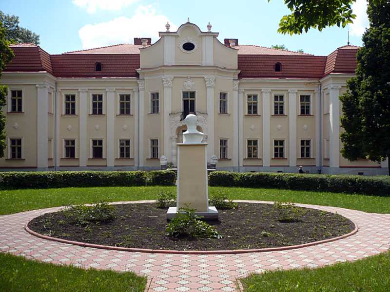 ДВОРЦОВЫЙ КОМПЛЕКС, 1730 г. Ансамбль состоит из дворца, служебных зданий, ограды с воротами и регулярного парка. Его композиция характерна для дворцово-парковой архитектуры XVIII в. В последней четверти XVIII а. благоустроен парк. [Памятники градостроительства и архитектуры УССР. – К.: Будівельник, 1985 г., т. 3, с. 182].