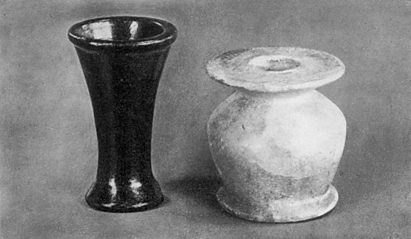 Сосудик из полированного темно-зеленого камня в виде бокала слегка расширяющегося книзу и с раструбом кверху. Маленький толстостенный сосудик с полусферическим корпусом и дисковидным венчиком.