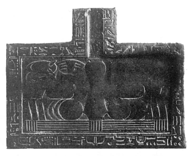Прямоугольная плита со стоком для жертвенных возлияний. В центре рельефно изображены жертвоприношения По краю плиты надпись: справа – посвящена описанию каждения ладаном, слева – содержит формулу «жертвенного возлияния». Имя владельца на памятнике не упомянуто.