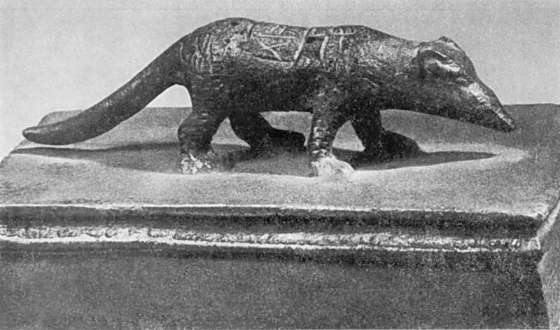 Ихневмон изображен на четырехугольной базе. На его спине – солнечные символы: два крылатых скарабея. В I тыс. до н. э. бронзовые статуэтки богов и посвященных им животных дарились в храмы с молитвой о здоровье и благополучии.