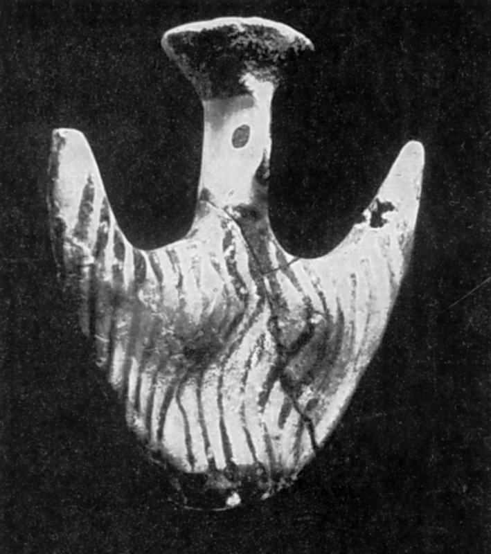 Примитивное, суммарное изображение: руки подняты кверху, нос клювообразный. На голове корона. Нижняя часть статуэтки и подставка утрачены.