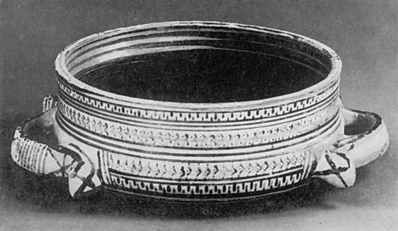 Ваза из группы «лекан без крышки», внутри покрыта коричневым лаком. Снаружи декорирована линиями, сплошь покрывающими поверхность сосуда, и полосками геометрического орнамента, между которыми – полоса из стилизованных идущих друг за другом птичек. Вазы геометрического стиля в музеях СССР немногочисленны.