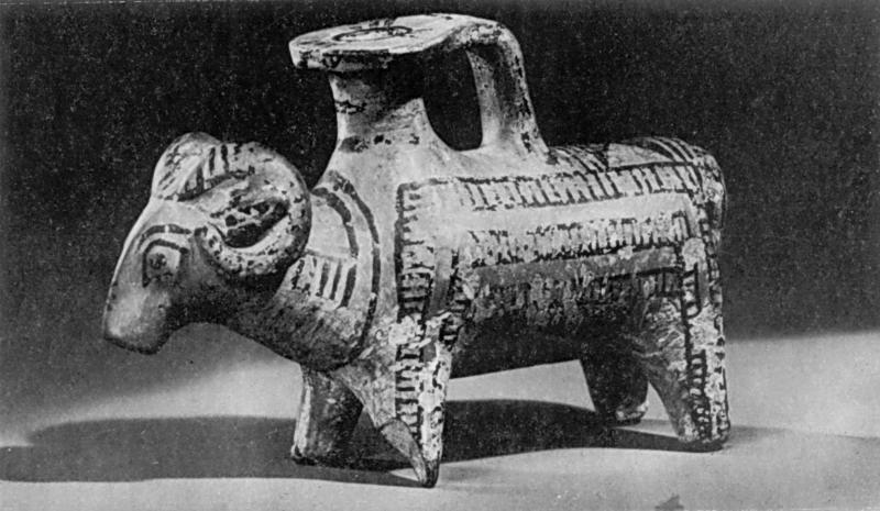 Сосудик изготовлен в виде стоящего барана. Его поверхность украшена рядами горизонтальных и вертикальных полос, создающих впечатление завитков шерсти.