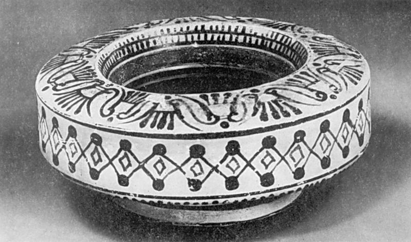 Ваза круглой, плоской формы с широкими плечиками и загнутым внутрь краем. С внешней и внутренней сторон покрыта орнаментом. В центре кольцевой подставки изображена птица с распростертыми крыльями.