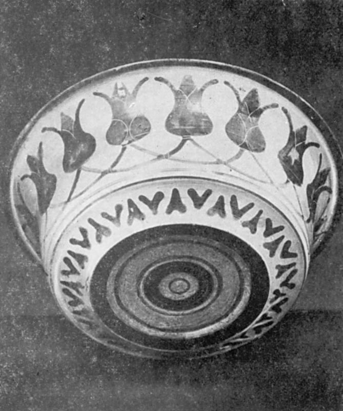Гирлянда из крупных, полураскрытых бутонов лотоса и геометрический орнамент почти полностью покрывают поверхность чаши, подчеркивая ее несколько необычную форму. Внутри она окрашена коричневым лаком.