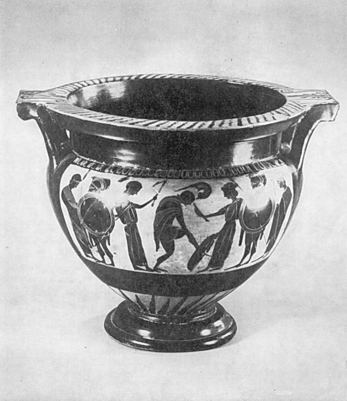 В центре многофигурной композиции воин в шлеме и плаще надевает кнемиду. На оборотной стороне вазы между крупными геральдическими львами три мужских фигуры: обнаженный юноша между мужчинами в длинной одежде. Такое сочетание наиболее часто встречается в группе ваз, условно называемых «халкидскими», где объединены вазы разных керамических центров.