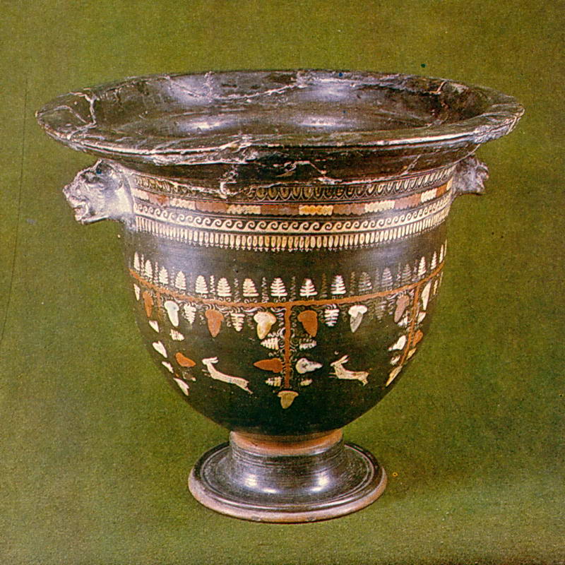 Небольшие полые ручки кратера выполнены в виде львиных голов. Роспись белой, красной и желтой накладными красками в сочетании с черным фоном создает своеобразный декоративный эффект, отличающий гнафийские вазы от керамики других южноиталийских центров.