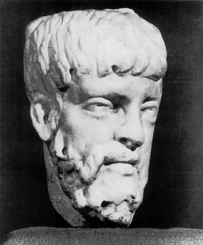 Изображен бородатый мужчина с волосами, небрежно зачесанными на высокий лоб. Выделенные зрачки, прикрытые веками, создают впечатление взгляда в сторону. Небольшие размеры головы, суммарная обработка затылочной части заставляют предполагать, что перед нами деталь скульптурного украшения саркофага.