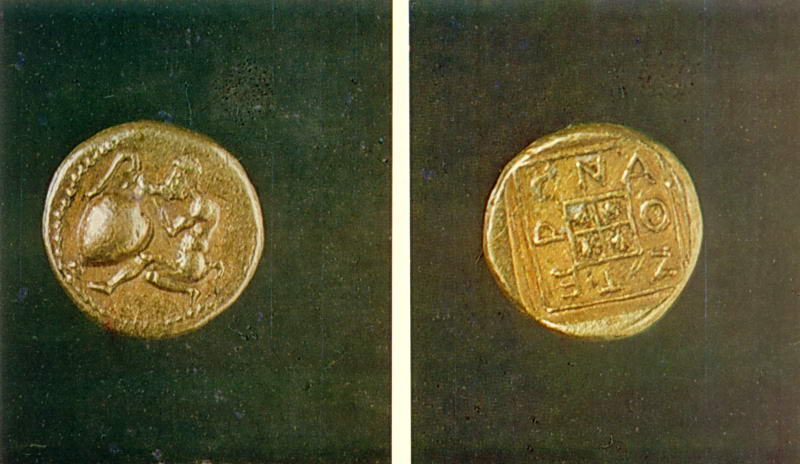 На одной стороне изображу силен, заглядывающий в ойнохою, на другой квадрат, разделенный на четыре равные части, внутри которых виноградные грозди. Монета очень редкая.