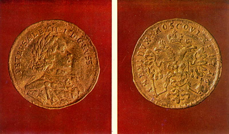 На лицевой стороне погрудное изображение Петра I, вокруг латинская надпись; на оборотной – государственный герб.
