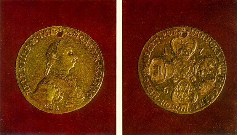 На лицевой стороне монеты помещено погрудное изображение Петра III и его титул, на оборотной – пять гербов, расположенных крестообразно: государственный (в центре) и царств Московского, Казанского, Астраханского и Сибирского. Десятирублевая монета Петра III, правившего менее полугода, относится к числу чрезвычайно редких.