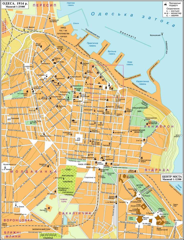 План м. Одеса (1914 р.)Розмір зображення: 736:960 піксел Карта накреслена Дмитром Вортманом, опублікована 14.02.2014 р. Умовні знаки |