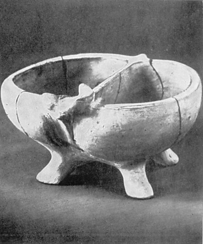 Двухчастная чаша на четырех ножках, наделенная зооморфными чертами: моделирована голова и хвост животного (баран). Сосуд, вероятно, имел ритуальное назначение.