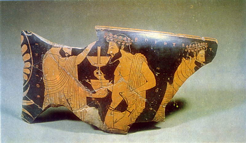 Сохранилась часть композиции: пьющие вино мужчины и флейтист. Фигуры очень выразительны, особенно центральная – Диониса с канфарами. Они выполнены в манере, характерной для лучших работ мастера Эпиктета, чья подпись сохранилась на чаше; помимо имени вазописца сохранилось имя Никосфена – гончара.