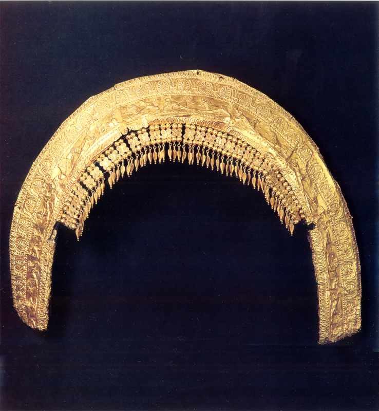 Діадема із рельєфними фігурами левів, пантер та рослинним орнаментом. До її нижнього краю приєднані пластини з каплеподібними підвісками.